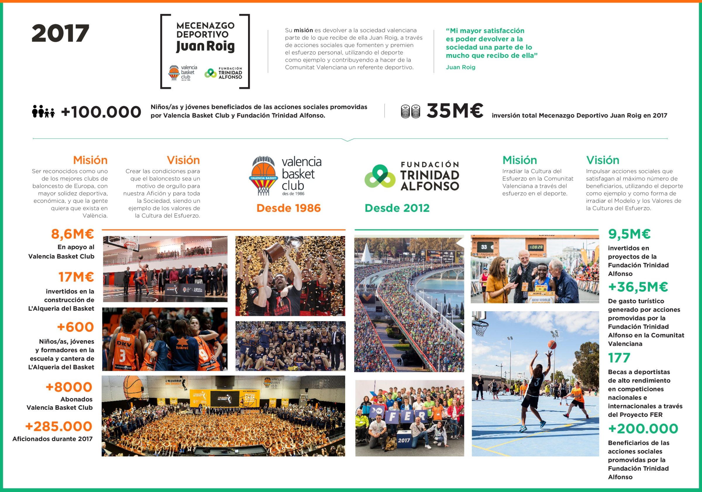 A ese número hay que añadir a los más de 650 personas que componen L’Alqueria del Basket, entre jóvenes, entrenadores y formadores en diferentes áreas. Los más de 8.000 abonados o los más de 285.000 espectadores que pasaron por La Fonteta para seguir al equipo que se proclamó por primera vez en su historia campeón de Liga, el Valencia Basket, son otros datos fundamentales para entender la trascendencia en la sociedad valenciana del “Mecenazgo Deportivo Juan Roig”.
